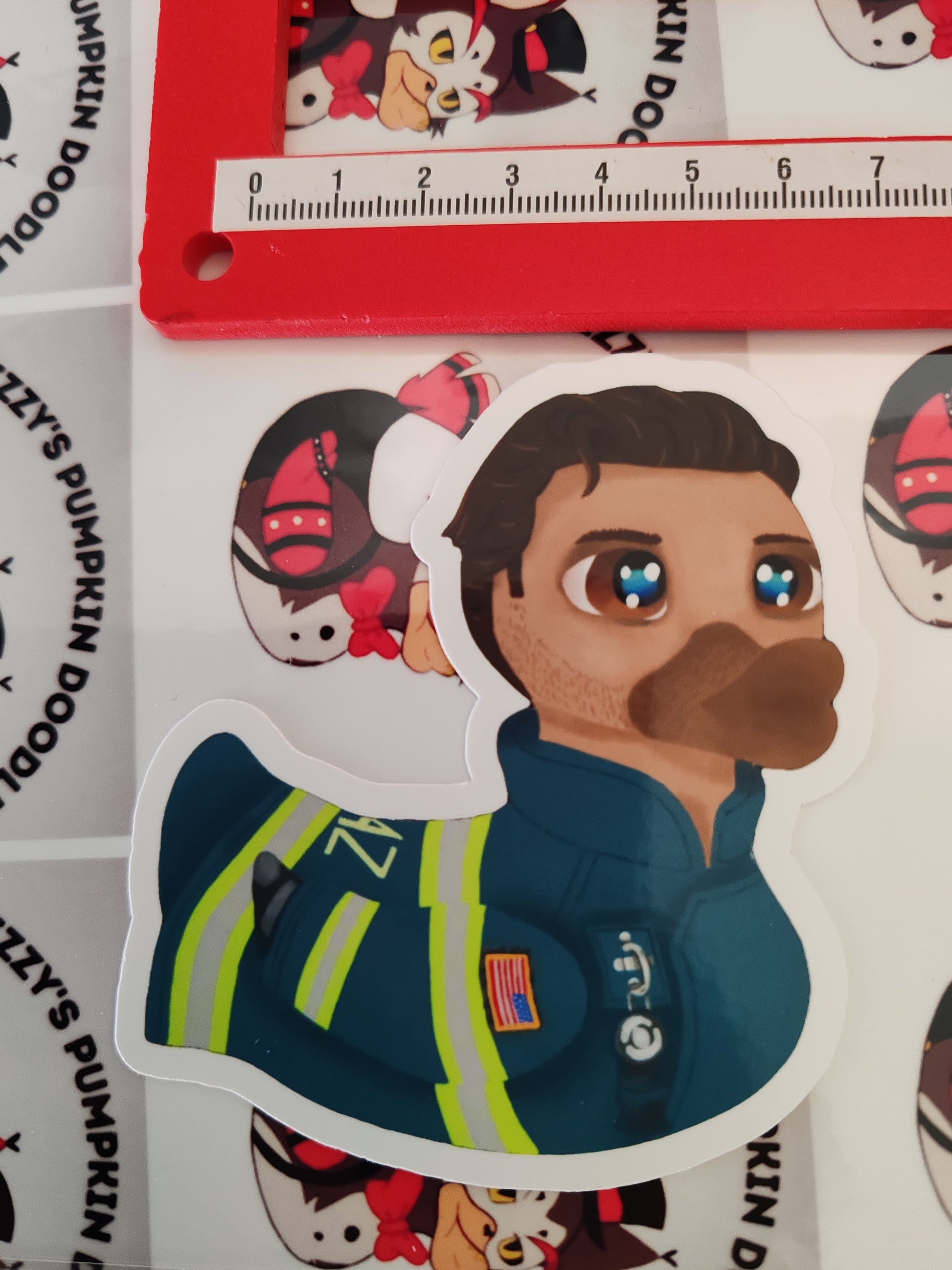 An original hand drawn sticker of 911 characters. Printed on a die cut sticker with strong adhesive, so they with stick to virtually anything, and stay there.